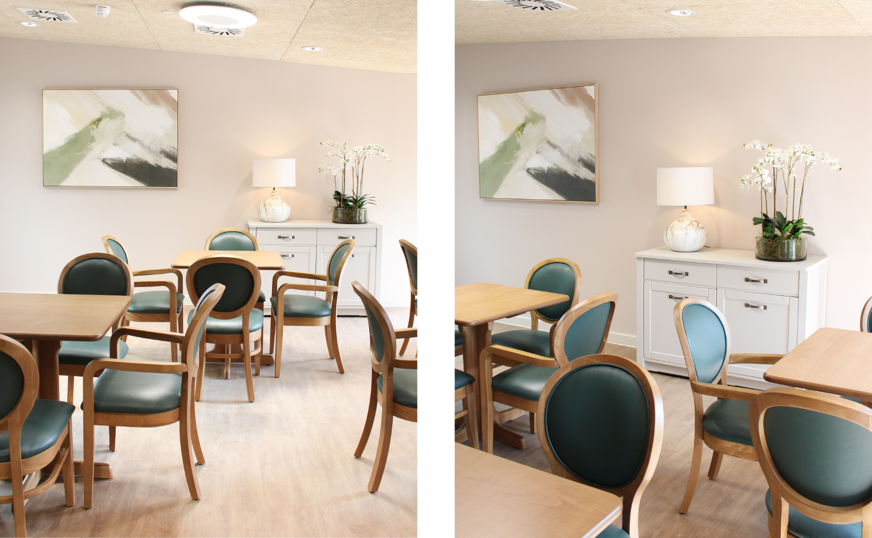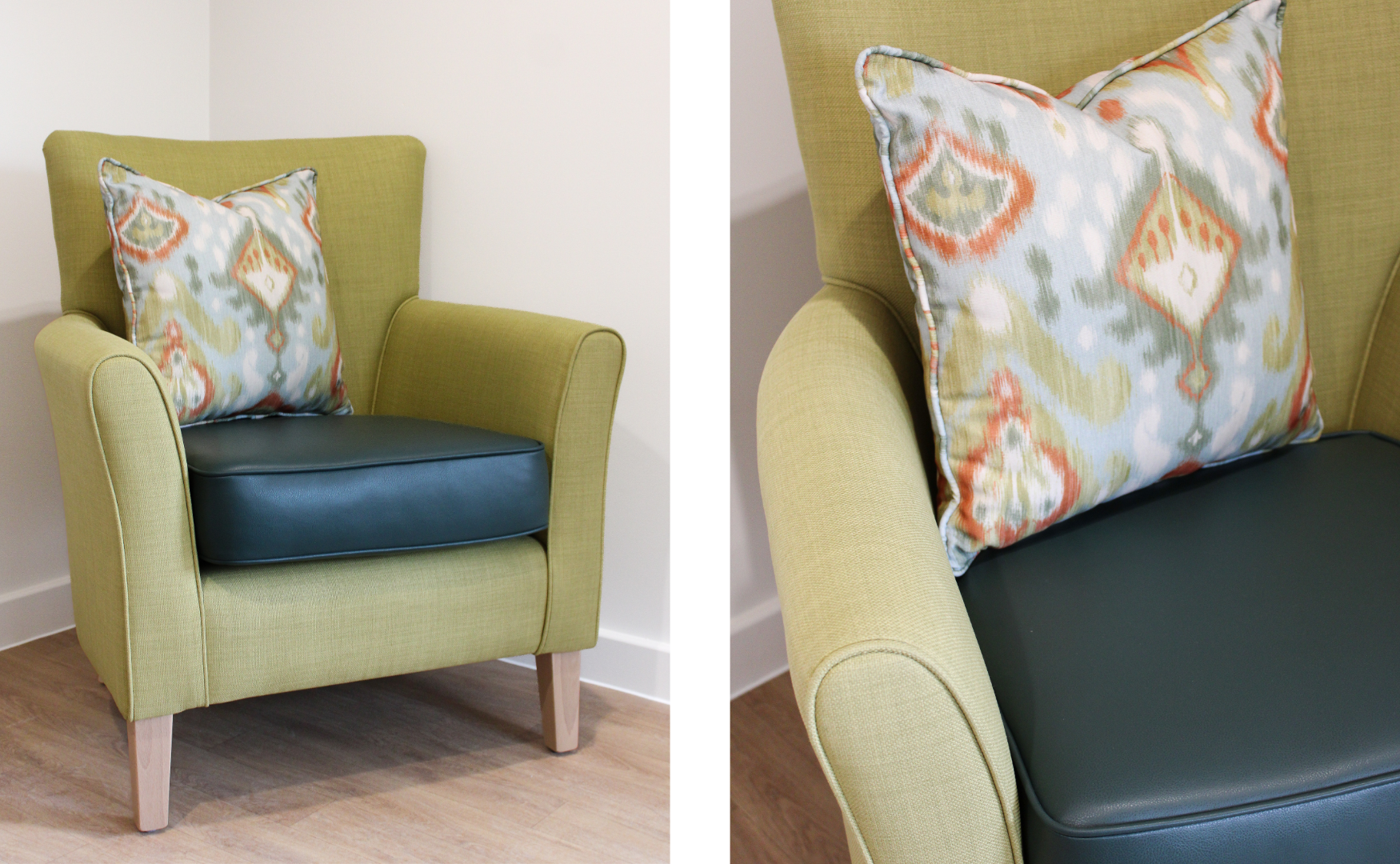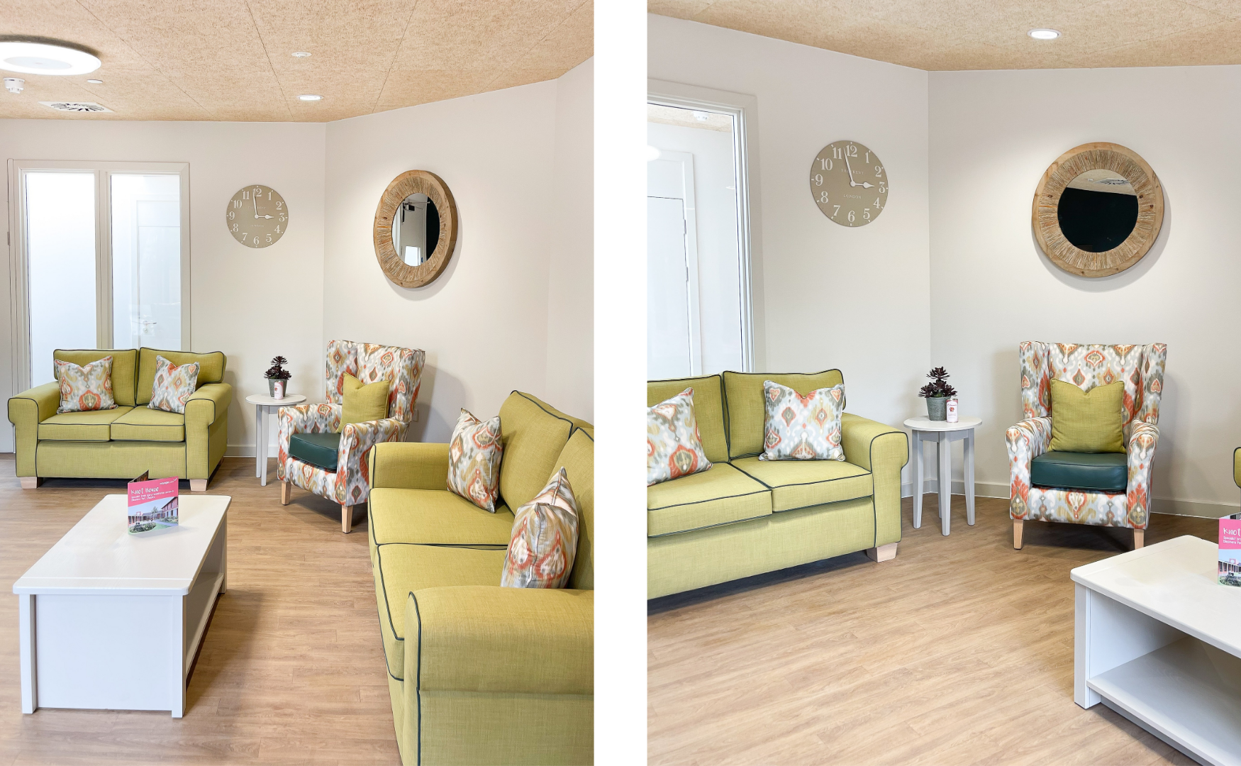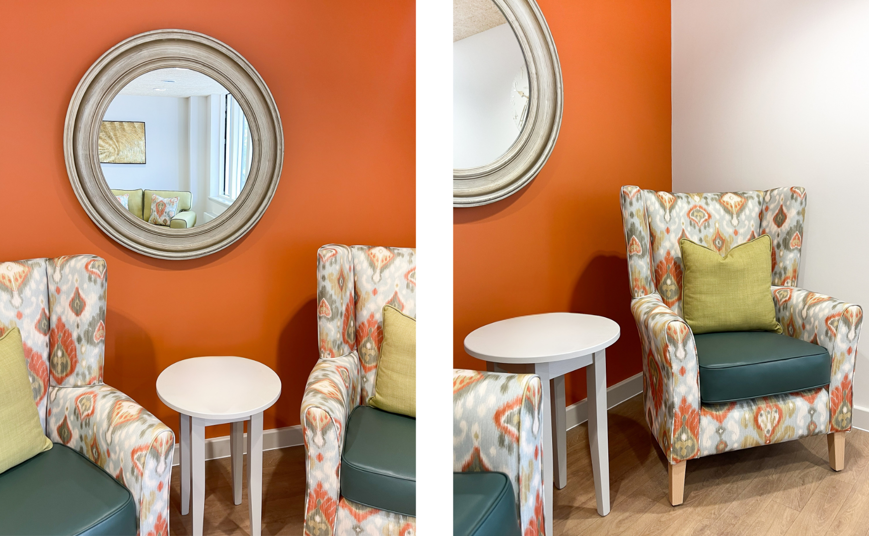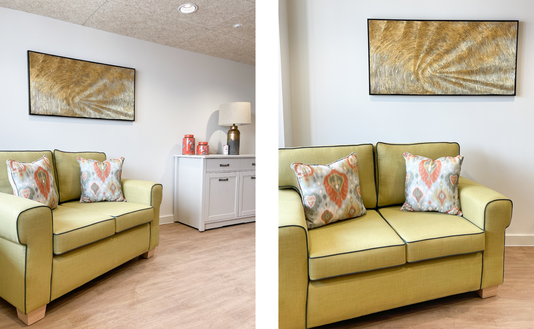 Working with our design team, the development team selected vibrant fabrics featuring olive greens, accented by soft blues and lively oranges to bring a pop of colour and warmth to the space. The carefully chosen furnishings, artwork, and accessories add a modern and homely touch, transforming the building into a welcoming, home-like environment for the residents and their families. This is going to be such a beautiful home for so many people!